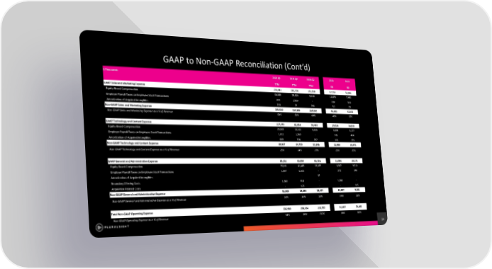 GAAP to Non-GAAP Reconciliation (Cont’d) $ Thousands 2020 Q2 2019 Q2 2018 Q2 2020 2019 TTM TTM TTM Q2 Q2 GAAP Sales and Marketing Expense 233,042 181,302 133,958 57,759 50,046 Equity-Based Compensation 36,849 25,429 9,140 10,878 7,952 Employer Payroll Taxes on Employee Stock Transactions 973 1,559 - 329 533 Amortization of Acquired Intangibles 200 29 788 50 29 Non-GAAP Sales and Marketing Expense 195,020 154,285 124,030 46,502 41,532 Non-GAAP Sales and Marketing Expense as a % of Revenue 54% 56% 64% 49% 55% GAAP Technology and Content Expense 117,470 82,658 59,483 29,514 24,819 Equity-Based Compensation 25,803 15,933 5,928 6,884 5,137 Employer Payroll Taxes on Employee Stock Transactions 1,011 1,260 - 381 434 Amortization of Acquired Intangibles 689 706 707 161 176 Non-GAAP Technology and Content Expense 89,967 64,759 52,848 22,088 19,072 Non-GAAP Technology and Content Expense as a % of Revenue 25% 24% 27% 23% 25% GAAP General and Administrative Expense 89,161 83,890 68,586 22,996 20,575 Equity-Based Compensation 35,891 41,445 32,875 8,367 9,510 Employer Payroll Taxes on Employee Stock Transactions 1,007 1,102 - 272 349 Amortization of Acquired Intangibles - - 37 - - Secondary Offering Costs 1,260 918 - 1,260 - Acquisition Related Costs - 835 - - 835 Non-GAAP General and Administrative Expense 51,003 39,590 35,674 13,097 9,881 Non-GAAP General and Administrative Expense as a % of Revenue 14% 14% 18% 14% 13% Total Non-GAAP Operating Expense 335,990 258,634 212,552 81,687 70,485 Non-GAAP Operating Expense as a % of Revenue 94% 94% 110% 86% 93% 24